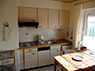 Die Wohnung hat ein Wohnzimmer mit Essecke und Küchenzeile, inklusive Herd und Geschirrspülmaschine.