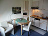 Die Wohnung hat ein Wohnzimmer mit Essecke und Küchenzeile, inklusive Herd und Geschirrspülmaschine.